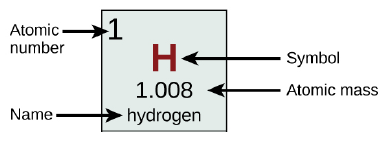 Each element in the table has information provided – some tables are more detailed than others but at a minimum, one normally sees the atomic symbol, the atomic number (# protons), and the atomic mass (weighted average of all known isotopes.