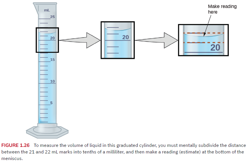 For analog devices, you can ‘read between the lines’ to add one more digit of precision. The reading above is 21.6 or 21.7 mL.