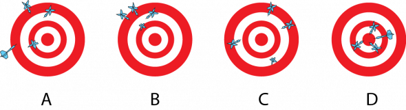 #1 is precise but not accurate; #2 is accurate but no precise; #3 is both