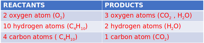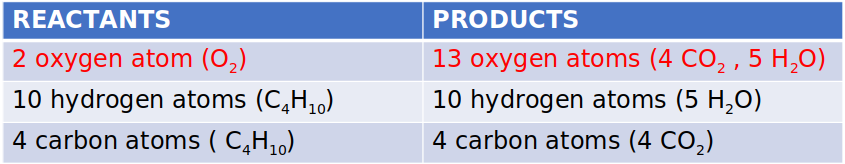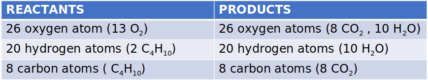 2 C4H10 + 13 O2 ➞ 8 CO2 + 10 H2O