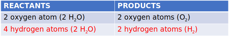 We need two more O on the right and twice the number of H on the right. Let’s alter H2O again, since it has both elements in it: