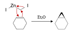 In the Simmons-Smith reaction, diiodomethane (CH2I2) is treated with zinc copper couple (Zn-Cu) to yield ICH2ZnI and subsequently reacted with an alkene to yield a cyclopropane. To prepare Zn-Cu couple, zinc dust is treated with CuCl or CuSO4. This is a highly stereoselective reaction that results in a cyclopropane product with e same stereochemistry as the starting alkene. The following is an example of cycopropanation of an alkene using ICH2ZnI, Zn-Cu, and Et2O